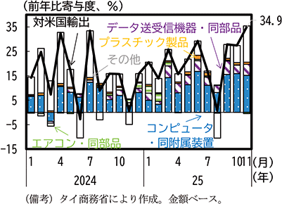 タイからの米国向け輸出は、2025年1月のトランプ政権発足以前からコンピュータ・同附属装置が増加しており、4月の相互関税措置以降もコンピュータ等が関税措置の適用除外となっていることもあり増加を続けている。ベトナムと同様にタイの輸出総額全体もおおむね増加が続いている。また、2024年と比べて電話機等の部品を始めとしたデータ送受信機・同部品の増加寄与が拡大している(第1-3-31図)。