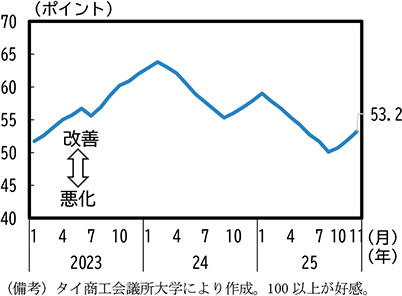 2025年のタイの実質GDP成長率をみると、1-3月期は純輸出のプラス寄与が高まった一方、在庫投資が押下げ要因となり、前年比3.2%となった。企業が在庫を取り崩して輸出を増加させたものとみられる。4-6月期は純輸出のプラス寄与は縮小したものの2.8%となった。景気に持ち直しの兆しがみられたものの、7-9月期では純輸出のプラス寄与は拡大したが、政府消費がマイナス寄与となり、成長率は1.2%にとどまった(第1-3-33図)60。また、消費者マインドも2025年初めから下がり始め、足下のマインドは4月の関税措置導入時より低位で推移している(第1-3-34図)。