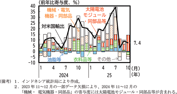 米国向け輸出は、2025年1月のトランプ政権発足以前から機械・電気機器・同部品、衣料品等が増加に寄与していた。2025年から太陽電池モジュール・同部品61の増加寄与が高まるとともに、ベトナムやタイとは異なり、8月の相互関税率の引上げ前に機械・電気機器・同部品、衣料品の駆け込みとみられる急増があった。8月以降に伸び率は低下したものの、太陽電池モジュール・同部品の増加は継続している(第1-3-35図)。