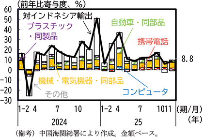 中国からインドネシア向けの財輸出をみると、機械・電気機器・同部品、自動車・同部品等が増加し、財輸出全体は緩やかな増加が続いている(第1-3-36図)。総じてみれば、米国による相互関税措置の前後で大きな変調はみられない。