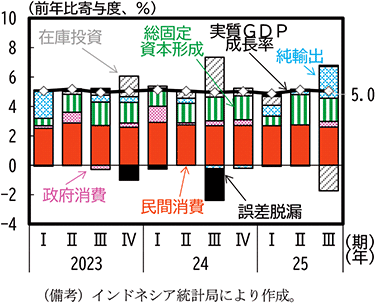 2025年のインドネシアの実質GDP成長率をみると、近年は5%近傍で推移しているところ、7-9月期では純輸出のプラス寄与は拡大したが、在庫投資がマイナス寄与となり、成長率は5.0%にとどまった(第1-3-37図)。