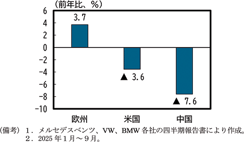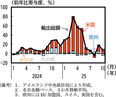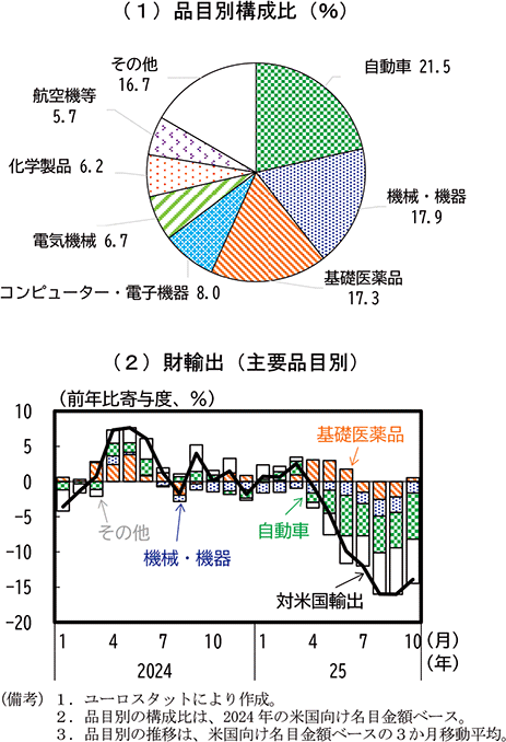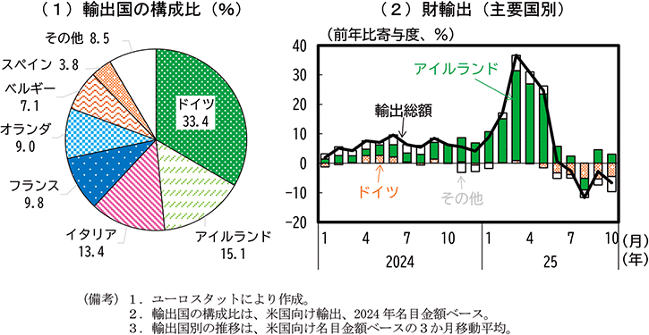 欧州では、自動車関税引上げにより、特にドイツの基幹産業である自動車輸出が大きな影響を受けている。医薬品産業が集積するアイルランドでは、関税率引上げを見越した大幅な対米輸出の増加とそのはく落による変動がみられたが、その後も医薬品が関税措置の適用対象外となっていることもあり、更なる関税措置の変更がなければ今後の景気への下押し圧力は限定的になると考えられる。