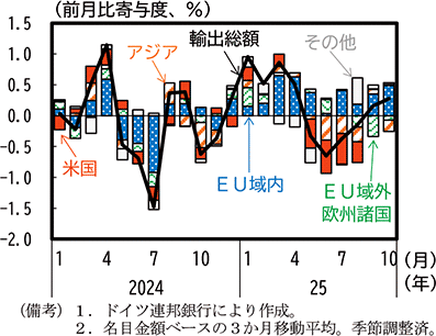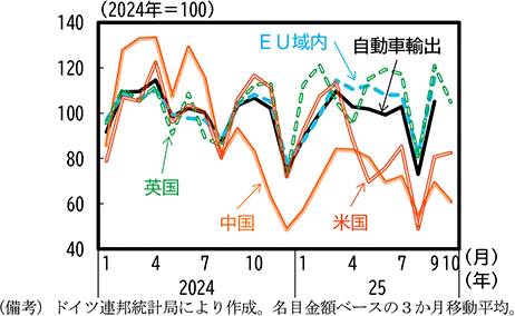 ドイツはユーロ圏最大の経済規模を持つ国であり、地理的に近い欧州諸国との取引量が多いが、国単位でみると米国が最大の輸出相手国(構成比10%)62となっている。2025年はEU域内への輸出が好調な半面、対米輸出で減少が続いている(第1-3-39図)。