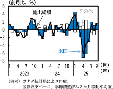 カナダの財輸出は、米国の大統領選挙でトランプ氏が当選した2024年11月から2025年初にかけて米国向けを中心に増加したが、米国の関税措置が導入された2025年3月以降は米国向けが大幅に減少する中で、年央にかけてカナダの財輸出全体としても減少傾向で推移し、その後は横ばい圏の動きとなっている(第1-3-3図)。