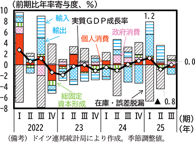 米国向け輸出の減少は、単なる外需の縮小にとどまらず、ドイツ経済に直接的な影響を及ぼしている。ドイツの実質GDP成長率でみると、輸出の弱さに加えて投資や消費も持ち直しに足踏みがみられる(第1-3-43図)。自動車業界では生産計画の見直しや操業調整が始まっており、こうした動きは、部品や素材の調達にも影響を与え、サプライチェーン全体に波及することで、ドイツ国内の関連産業の活動を抑制する要因ともなっている。