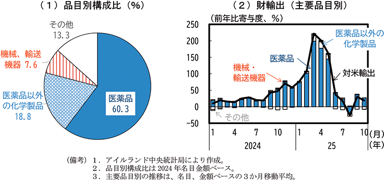 2024年後半以降、米国の関税政策をめぐる不透明感がアイルランドの医薬品輸出動向に一時的な影響を与えたことは統計データからも明らかである。現状では医薬品は米国の関税措置の適用除外とされているため、アイルランド景気への下押し圧力は限定的である。ただし、トランプ大統領は度々医薬品関税の導入を示唆する発言を行っており、不確実性の高い状態は続いている。