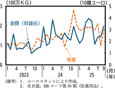 さらに、2025年3月から5月にかけては金額ベースで急増した一方、重量ベースの伸びは限定的である。米国から関税が課される前に、企業は単価が高く、高関税の影響を大きく受ける高付加価値医薬品の輸出を急増させたとみられる。