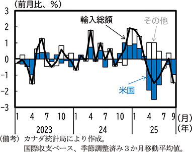 また、第1節でみたように、カナダは米国の関税措置に対抗して対米関税を相次いで引き上げている。カナダの財輸入の動向をみると、財輸出と同様に2024年末から2025年初にかけて対米輸入を中心に増加した後、2025年3月頃からは対米輸入が大幅に減少する中で全体として減少傾向で推移している(第1-3-5図)。