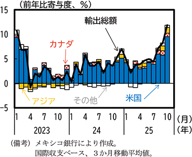 米州では、対米輸出品目の多くが関税適用対象となるカナダでは財輸出が顕著に減少し、2025年4-6月期の実質GDP成長率がマイナスに転じた一方、AI関連需要も背景に、メキシコでは米国向けを含めて財輸出は増加基調を維持し、2025年4-6月期の実質GDP成長率も1-3月期から上昇するなど、明暗が分かれた。