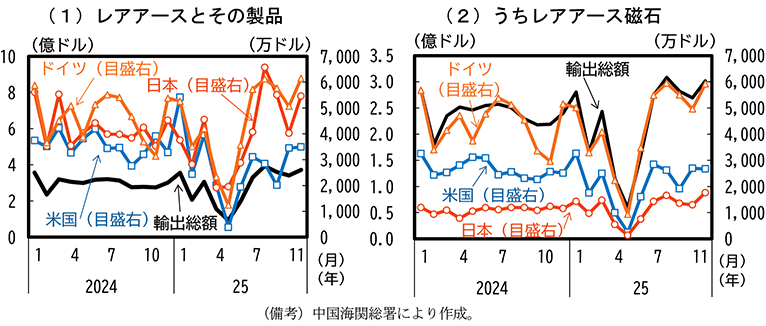 中国は世界最大のレアアース産出国であり、電気自動車(EV)のモーター等の素材として不可欠なレアアース磁石の多くを供給している。2025年4月の米国の相互関税発表後、中国は一部のレアアース47輸出を許可制とする管理強化を実施した。その結果、同月の磁石を含むレアアース輸出は急減し(図1)、各国の自動車メーカーは生産計画の見直しを迫られた。5月、6月の米中間の閣僚級協議も経て、7月にはレアアース輸出が前年並みに回復したが、10月上旬に中国はレアアース等に関する複数の追加的な輸出管理措置48を発表した。その後、10月末の米中首脳会談を経て、11月7日、中国は10月に発表した一連の措置の実施を1年間停止することを公表した。ただし、4月に導入された一部レアアース品目の輸出許可制は継続しており、供給リスクは残存している。