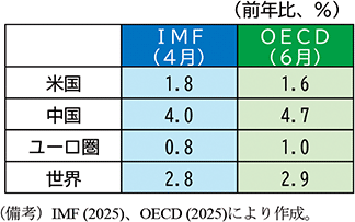 第二次トランプ政権の関税措置が導入された当初の2025年春頃には、多くの国際機関が2025年の世界の実質GDP成長率について3%を下回る顕著な減速を予測していた(第1-4-1表)。こうした予測においては、関税引上げによる貿易に対する直接的な影響、景気の下押しが貿易を通じて間接的に波及する効果、政策に対する不確実性の高まりと経済主体のマインド悪化によって米国及び各国・地域の景気が押し下げられることが想定された。しかしながら、実際には、第2章でも述べるように、2025年の世界の実質GDP成長率は3.2%程度とおおむね2024年(3.3%)と同程度の成長を維持する見込みとなっている。ここでは、こうした予測と実績とのかい離の要因について、経済モデルから試算される関税措置の影響と実際の経済動向を比較することで分析することとしたい。