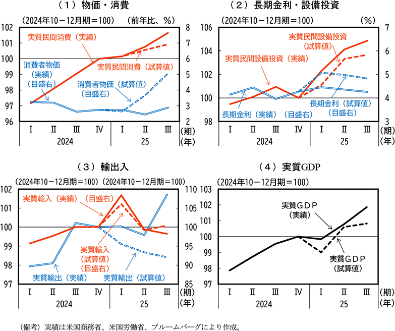 まず、米国経済について試算すると、2025年1-3月期には実効関税率の上昇が限定的な中で将来の米国物価及び金利上昇を見越したドル高が進行し66、実質輸入67が急増する。その後、4-6月期以降は関税込みの輸入物価が上昇することに伴って実質輸入が減少傾向で推移する一方、消費者物価上昇率は7-9月期にかけて5%程度まで上昇する。その結果、実質民間消費は3四半期連続で年率2%を下回る低い伸びに抑制されると試算された(第1-4-2図(1))。また、物価上昇に伴って長期金利も5%前後まで上昇し、実質民間設備投資の伸びは7-9月期に鈍化する(第1-4-2図(2))。国内物価の上昇は米国製品の価格競争力を低下させ、米国の実質輸出は1-3月期以降減少を続ける(第1-4-2図(3))。実質GDP成長率は、実質輸入の大幅な変動に伴って、1-3月期に減少、4-6月期に反発した後、7-9月期には前期比年率0.9%と弱い伸びとなる姿となった(第1-4-2図(4))。