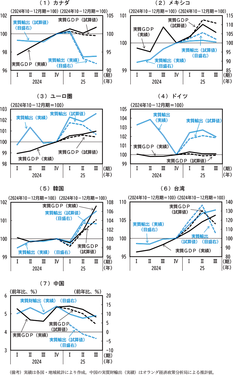また、他の主要国・地域の多くは1-3月期から4-6月期にかけては実質輸出が増加し、7-9月期から減少に転じるという試算結果となっている(第1-4-3図)。メキシコやドイツを含むユーロ圏、韓国、台湾では、1-3月期の関税措置導入後、先行きの米国物価及び米国金利の上昇を見越して、各通貨がドルに対して減価することで短期的な実質輸出を押し上げる一方、7-9月期頃からその反動や関税引上げによる実質輸出の下押し効果が徐々に発現していく結果となった。カナダについても同様の為替変動が生じるものの、他の国・地域と比べて輸出構造が関税込み輸出価格の変動の影響を受けやすく、実質輸出が4-6月期には減少に転じ、実質GDPも7-9月期にかけて2四半期連続でマイナス成長するという試算結果であった(第1-4-3図(1))。中国については、モデル上のデータと実際に把握できるデータとの概念差にも留意する必要があるが、管理フロート制の下で為替レートの調整が生じない中で、米国の関税引上げによる輸出競争力の低下を受けて4-6月期には実質輸出が前年比でマイナスに転じ、実質GDP成長率も7-9月期にかけて前年比4%台半ばまで低下していく姿となった(第1-4-3図(7))。