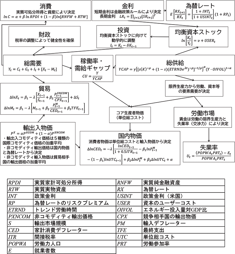 試算に用いるNiGEM (National Institute's Global Econometric Model)は、英国国立経済社会研究所(NIESR:National Institute of Economic and Social Research)が開発・提供している世界全体を網羅した多地域型マクロ経済モデルである。主要国の経済は図1のような構造(それ以外の国・地域についてはやや簡素化された構造)となっており、貿易等のフローによって相互に連関しているため、特定国・地域の経済や政策の変化が他の国・地域の経済に与える影響を試算するのに適したモデルである。モデル内の各方程式の基本構造は、短期的なかい離を許容しつつ長期的に均衡に向けて収束していく誤差修正モデルとなっているほか、為替レート等の一部変数は将来の期待を織り込んでフォワードルッキングに決定される形となっている。