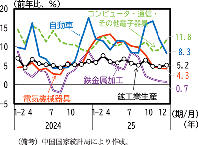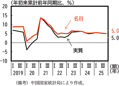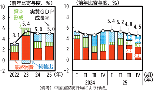 2025年通年の実質GDP成長率は5.0%となった。2025年3月の全国人民代表大会(以下「全人代」という。)で示された目標値の「5%程度」と一致する結果となった。他方で、年後半の伸び率を四半期ごとにみると、7-9月期は前年同期比で4.8%、10-12月期は同4.5%となり、2025年前半の5%台前半の伸びに比べて伸び率が低下している。