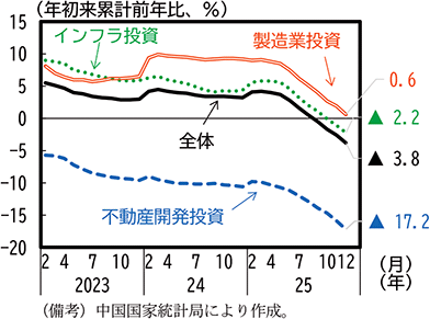 固定資産投資については2025年半ばから伸び率が低下し、1-12月期累計では前年同期比▲3.8%となり、政府による支援策がある中でも47、弱い動きとなっている(第2-2-12図)。