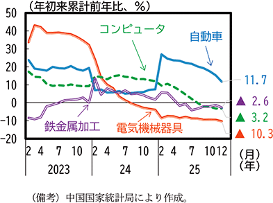 通商関係については、2025年10月末の米中首脳会談によりフェンタニル関税は20%から10%に引き下げられ、相互関税は2026年11月まで10%となったが、米国向けの財輸出はマイナスが続いており、米中間の通商問題の影響には引き続き注意が必要である。