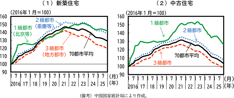 2025年の都市階級別の動向をみると、新築住宅では1級都市(北京等)と2級都市(重慶等)の住宅価格が、中古住宅では1級都市の住宅価格が年初に下げ止まりの動きをみせたものの、2025年の半ば以降では新築住宅、中古住宅ともに1級都市から3級都市(地方都市)の全ての都市階級で住宅価格が下落している(第2-2-14図)。