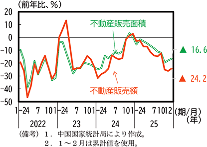次に、住宅需要の動向を確認すると、不動産販売面積及び販売額は、2024年9月の住宅ローン金利の引下げや2軒目住宅購入時の最低頭金比率の引下げ、10月の不動産への融資強化等の政策対応49も背景に、2024年末に前年比プラスに回復したものの、2025年に入り再びマイナスに転じ、減少幅が拡大している(第2-2-15図)。