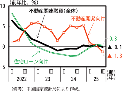 中国では2022年から人口減少局面に入っている。このことも住宅需要の下押し圧力となっており、不動産販売面積、不動産関連融資残高、住宅価格それぞれにおいて2025年は低下傾向にあり、不動産市場の停滞に改善の兆しがみえない。