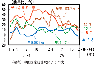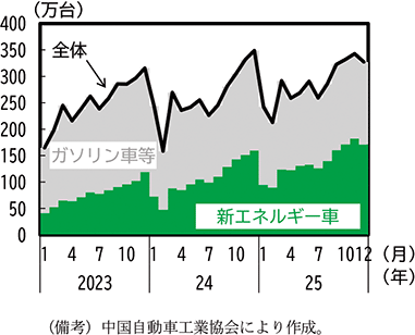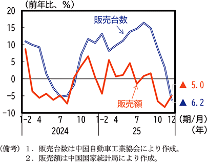 自動車販売台数全体としては、2024年末から前年比2桁のプラスまで増加した後、政策効果のはく落もあって年末には前年比マイナスに転じている(第2-2-5図)。