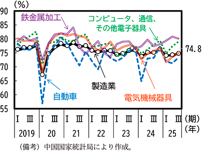 製造業の稼働率と在庫の動向をみると、製造業全体では、2025年の稼働率は75%を下回る程度で推移しており、大きな変動はなく(第2-2-19図)、在庫数量についてもおおむね前年比4%増で推移し、生産の伸び率から大きなかい離はみられない(第2-2-20図)。国内需要が低調な中にあっても、輸出の増加によって過度な在庫調整は抑制されている姿がうかがわれる。