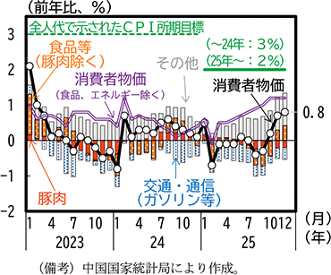 2025年の消費者物価(CPI)上昇率は前年比ゼロ近傍で推移しており、全人代で示された2%程度の目標値を大きく下回っている。