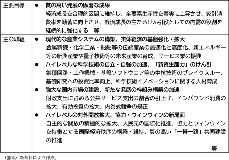 同建議では、2021年の全人代で決定した「2035年までに1人当たりGDPが中等先進国の水準に達し、社会主義現代化を基本的に実現する」との基本方針を維持した上で、計画期間における経済成長に係る目標については、「経済成長を合理的区間に維持し、全要素生産性を着実に上昇させ、住民消費率を顕著に向上させ、経済成長の主たるけん引役としての内需の役割を継続的に強化する」とした。具体的な取組としては、現代的な産業システムの構築といった供給側の取組が筆頭に掲げられたものの、消費を中心とした内需拡大に取り組む姿勢が強調された内容となっている。また、通商、経済安全保障環境の変化も踏まえ、対外開放の拡大をうたいつつ、ハイレベルな科学技術の自立・自強も強調されている。なお、5年前には、習近平総書記による建議の説明において「2035年までにGDPまたは1人当たり可処分所得の倍増を実現することは完全にあり得る」旨の言及がされたが、今回はこれらに関する具体的な言及はなされなかった。