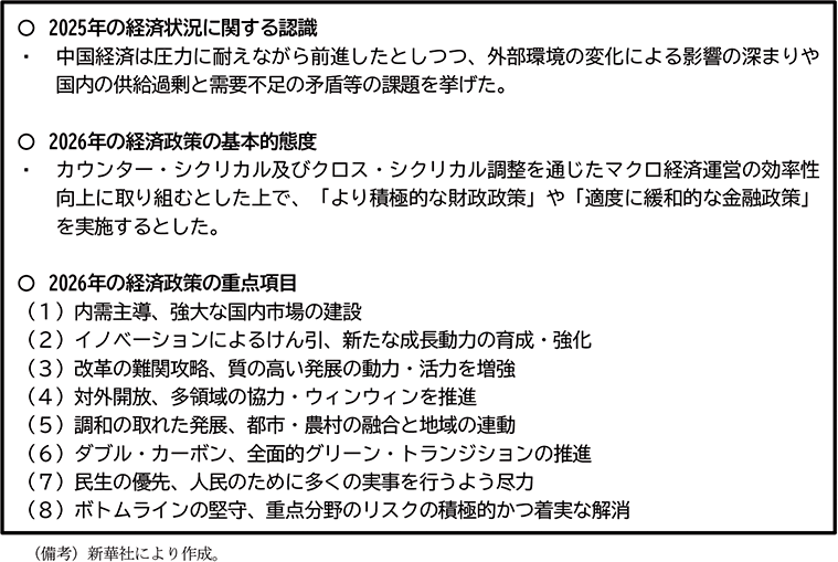 10月の四中全会に続いて、12月10日から11日に中央経済工作会議54が開催され、2026年の経済政策の基本方針等が示された(第2-2-25表)。現状認識として、外部環境の変化による影響、国内の供給過剰と需要不足の矛盾について指摘されている。