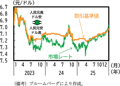 人民元の動向については、中国人民銀行による取引基準値の引上げもあり、2024年11月以降にみられていた人民元の取引基準値と市場レートのかい離は、2025年5月頃にはおおむね解消し、その後、取引基準値及び市場レートは対ドルで元高に進んでいる(第2-2-27図)。取引基準値の引上げに加えて米国での利下げの進展、さらに、中国の2025年1月から11月までの累計の貿易黒字は1兆758億ドルとなり、初めて1兆ドルを超える貿易黒字となったこと等が元高の背景にあるとみられる。