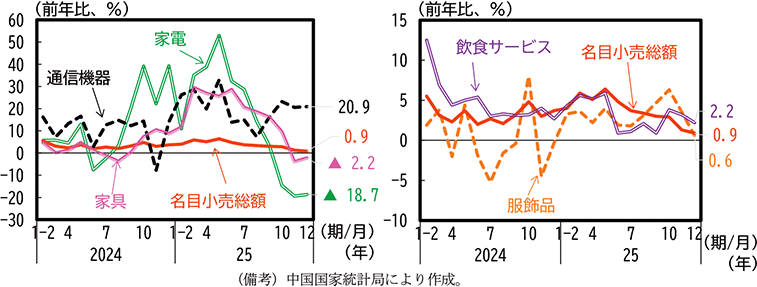 飲食サービスについては、2025年以前から名目小売総額以上の伸びで推移していたところ、2025年5月に行われた倹約令44の改定を背景に6月以降は伸びが低下していた。10月は国慶節等の休暇シーズンもあり前年同月比は3.8%まで伸びが回復し、12月には2.2%となった。全体として、消費はこのところ弱含んでいる。