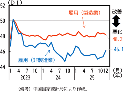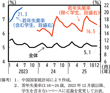 中国では7月に新卒者が労働市場へ参入し、7月から8月にかけて若年を中心に失業率が上昇する傾向があるが、2025年8月の若年失業率は18.9%まで上昇したものの12月には16.5%に低下しており、2024年と同様の動きとなった。