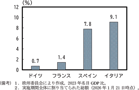 ユーロ圏では、2021年2月に感染症拡大からの経済回復支援を目的とした「復興・強靭化ファシリティ(Recovery and Resilience Facility)71」(以下「RRF」という。)が設立され、以降EU加盟国へ助成金や融資を提供している。RRFの助成金割当の70%は「人口」、「1人当たりGDP」、「2015年から2019年の平均失業率」、30%は「2020年の実質GDPの落ち込み」、「2020年から2021年の実質GDPの累積損失」により決定される。以上のような基準により、EUにおいて比較的失業率が高く、感染症拡大時の経済的損失が大きかったイタリア、スペインではRRF割当額対GDP比が大きくなっており、他の主要国に比べて設備投資の著しい増勢がみられる(第2-3-9図(3)、第2-3-10図)。こうしたRRFによる支出の下支えもあり、ユーロ圏の設備投資は2021年以降増加傾向となっている。