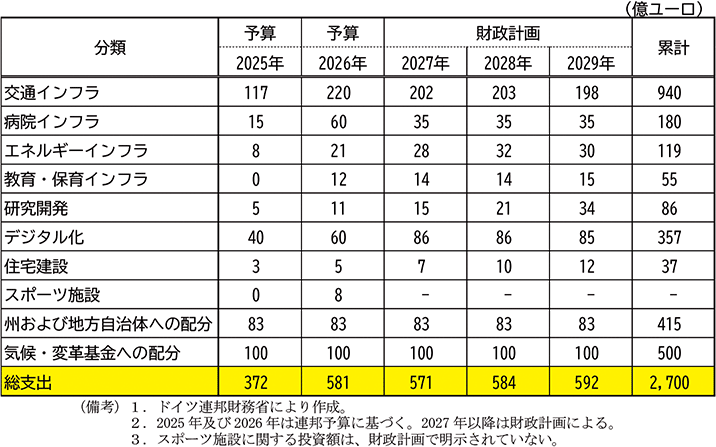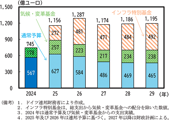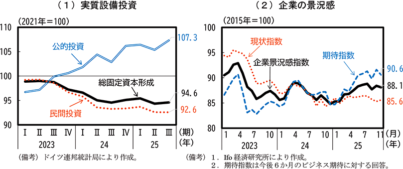 先行きも期待感がみられている。ユーロ圏主要国の中でもドイツでは、企業の借入金利の上昇や、中国等の主要輸出相手国における需要低下に伴う財輸出の減少を背景に、企業の設備投資マインドが低下し、2023年以降は民間部門を中心に設備投資が弱含んでいる(第2-3-11図(1))。こうした状況も背景に、ドイツ政府は2025年3月に「インフラ分野における投資需要の高まり72」と「安全保障構造の根本的な変化73」を理由に基本法(ドイツの憲法)を改正し、(1)交通インフラ等を含む各種インフラや気候変動対策を対象にした特別基金74、(2)名目GDP比1%を超える防衛費、の2点について「債務ブレーキ」75の対象外とすることを決定した76。2025年7月には「投資ブースター」と呼ばれる投資促進税制77を開始したこともあり、企業の景況感には改善がみられ(第2-3-11図(2))、政策効果の発現時期には留意する必要があるものの、ドイツの設備投資は回復していくことが期待される(第2-3-12図、第2-3-13表)。