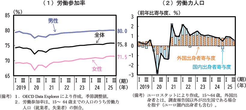 労働参加率の傾向については、上昇傾向にあり、足下では75.8%と感染症拡大前の2019年の水準を上回って推移している(第2-3-17図(1))。一方、労働力人口の増勢は鈍化しており、外国出身者(ユーロ圏内を含む出生国以外で働く労働力)の寄与が大きくなっている(第2-3-17図(2))。
