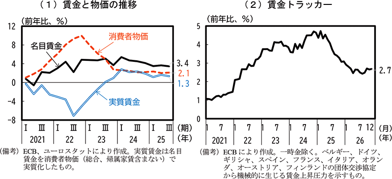 欧州中央銀行(以下「ECB」という。)が各国の団体交渉協定を基に公表している賃金トラッカーによれば、2026年の賃金上昇率は2023年から2025年と比較して、緩やかに推移することが見込まれる(第2-3-18図(2))。