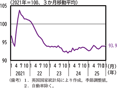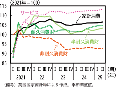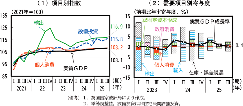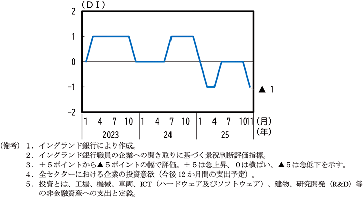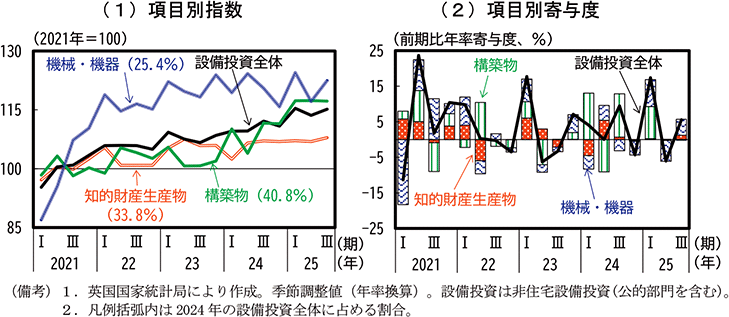 2024年7月にスターマー政権が発足し、先行き不透明感の緩和や政策金利の引下げを受けた借入負担の軽減もあいまって持ち直しの動きがみられたが、米国の政策動向の影響を受けた不透明感の高まりから、英国の設備投資はおおむね横ばいとなっている。
