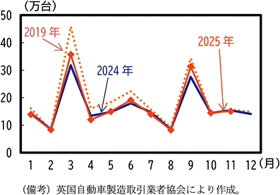 また、自動車の新規登録台数をみると、感染症拡大による供給制約が既に解消されていた2024年も年間を通じて2019年(感染症拡大前)を下回る水準が続いているものの、2025年7月以降は2019年に迫る水準となり、2025年10月には14.5万台と2019年10月の14.3万台を上回ったことから、回復の兆しがみられる(第2-3-28図)。2025年7月から始まった英国政府のEV購入助成制度99により、PHEVやBEV等の購買需要が喚起されたことで、当該車種において前年比30%を超える販売台数の伸びを記録したことが全体の販売台数増加の主因とみられる。