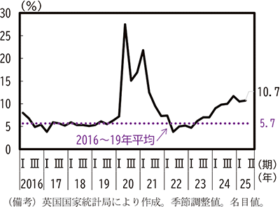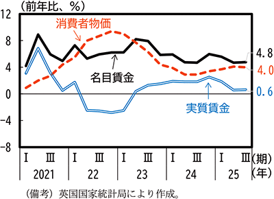 英国経済の動向を実質GDPの推移から概観97する。英国では2022年後半以降、急激な物価上昇と政策金利引上げ等により、実質GDPはおおむね横ばいで推移してきたが、消費者物価上昇率の低下に伴う実質賃金の上昇等を受けて内需が持ち直したことに加え、好調な輸出がけん引する形で外需も堅調に推移し、実質GDP成長率は2024年1-3月期以降、7四半期連続でプラスを記録している98。ただし、2025年7-9月期には外需が増加からおおむね横ばいに転じたことに加え、実質賃金上昇率の鈍化や失業率の上昇とともに内需も横ばい傾向となったことで実質GDP成長率の伸びは鈍化しており、景気の持ち直しが緩やかになっている(第2-3-25図)。