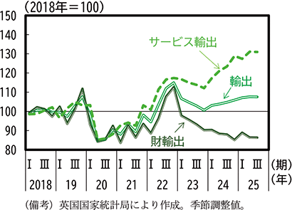 続いて、輸出の動向を確認すると、2020年1月のEU離脱とその後の感染症拡大があいまって、2020年4-6月期に財輸出、サービス輸出がともに大きく減少した。その後、対GDP比(2024年)で12.8%を占める財輸出は、2022年後半の一時的な増加を除き102減少傾向にある。2024年10-12月期には、米国向け輸出の増加を背景に一時的に増加に転じたものの、その後は弱含んでいる103。対GDP比(2024年)で16.6%を占めるサービス輸出も、感染症収束を受けた海外からの観光客の回復等から好調に推移していたが、2025年7-9月期以降はおおむね横ばいとなっている104(第2-3-34図)。