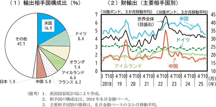 こうした輸出の動きについて、相手国別の動向とともに分析すると、2024年の主要輸出相手国は、米国(構成比16.9%)、ドイツ(同8.4%)、オランダ(同7.4%)、アイルランド(同6.6%)、フランス(同6.2%)、中国(同5.0%)となっており、財輸出全体としては2023年12月以降緩やかな減少傾向にある中で、米国向け財輸出は2024年10月から2025年3月にかけて大きく増加した(第2-3-35図)。2025年1月の第二次トランプ政権発足前後に起きた、関税引上げを想定した駆け込み輸出の影響とみられる。その後は駆け込み影響のはく落で減少傾向が続いており、英国財輸出全体を下押ししている。なお、中国向け輸出は大きく変動している時期105もあるが、2023年以降は停滞しており横ばい圏内が続いている。