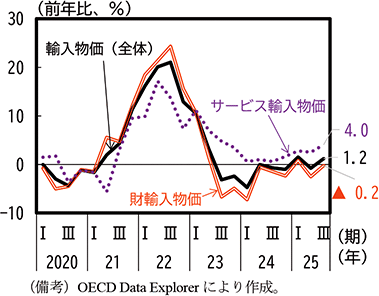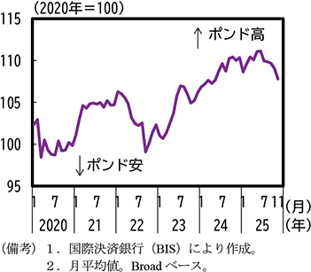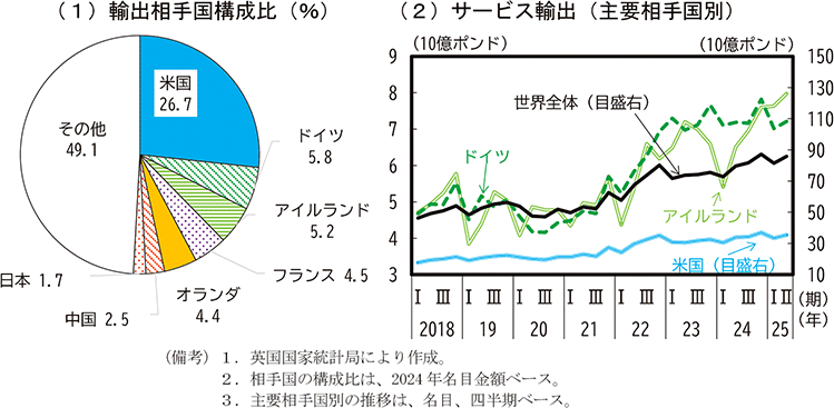 先行きについては、英国は名目GDPに占めるサービス輸出の割合が財輸出より高く106、サービス輸出には追加関税が課されていないため、米国の政策動向による直接的な影響は相対的に小さいといえるものの、ユーロ圏や世界経済の変動を通じた間接的な影響には留意する必要がある。