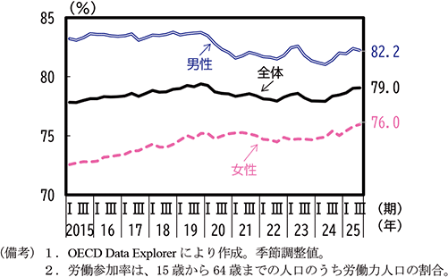 労働参加率については、感染症拡大後、男性の労働参加率が精神疾患等長期疾病に伴う非労働力化等の影響を受け、2019年10-12月期から2021年1-3月期にかけて低下したこと等から、男性の労働参加率は感染症拡大前の水準には戻っていない(第2-3-38図)。しかし、全体としては2024年半ばから上昇基調にあり、ユーロ圏と比較しても高い水準を維持している。