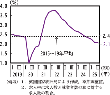 続いて、労働需要の強さを求人率の動向から確認すると、2021年以降、経済活動の再開等を受けて労働需要が増加したことから求人率が上昇していたが、政策金利の引上げを受けた労働需要の減少により低下傾向となった。さらに、2024年10月末に公表された秋季予算において国民保険料の企業負担の増加が決定されると、人件費の高まりを嫌気して雇用を抑制する動きがみられ、2025年1-3月期の求人率は2.3%と感染症拡大前を下回る水準まで低下した(第2-3-39図)。失業率は、低水準にあった2022年に比べ、2023年に入って以降は上昇傾向にあり、感染症拡大期に迫る高さにある(第2-3-40図)。英国の労働需給は緩和傾向にある。