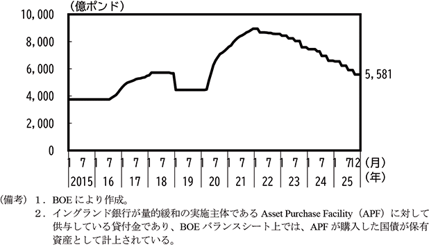 また、BOEは、金融政策目的で保有する英国債の削減を進めている。これは量的引き締めの一環で、2022年2月に満期を迎えた国債の再投資を中止して以来、現在に至るまで継続している(第2-3-46図)。2024年10月から2025年9月の1年間で保有残高を1,000億ポンド削減して5,580億ポンドとする計画を実行した後、直近では2025年9月の金融政策委員会において、2026年9月までに金融政策目的で保有する国債を700億ポンド116削減し、4,880億ポンドとする計画を公表している。