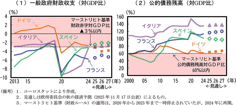 イタリアの政府債務残高は、2024年対GDP比134.9%と、ユーロ圏においてギリシャに次ぐ高水準にある。こうした中、イタリアはEUの過剰財政赤字是正手続(Excessive Deficit Procedure)120の対象からの脱却を目指し、財政赤字の削減に取り組んでいる。一般政府財政赤字対GDP比は、2024年の▲3.4%から2027年には▲2.6%まで縮小する見通しであり、EUの財政基準を満たすことが見込まれている。一方で、公的債務残高は2027年にはGDP比137.2%に達する見通しであり、財政の持続可能性については、引き続き注視する必要がある。スペインは、2024年12月に成立した税制措置121や堅調なGDP成長率を背景に、2027年の財政赤字は対GDP比▲2.1%まで縮小する見通しである。公的債務残高の対GDP比は、2024年の101.6%から2027年には97.1%まで低下すると予測されている。