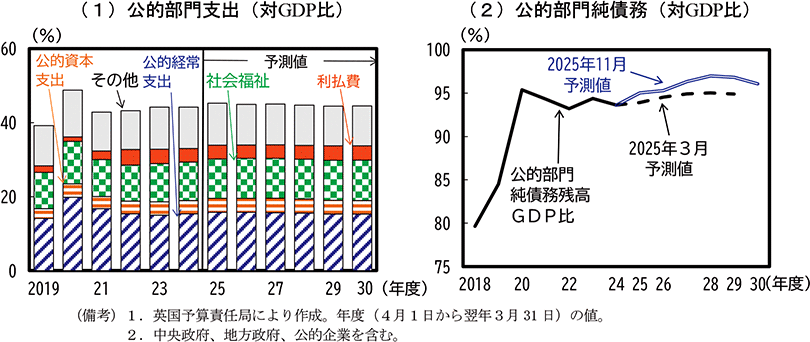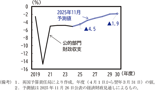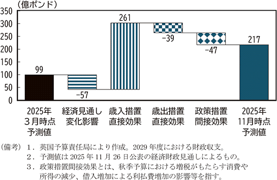 英国では、経済成長と財政健全化の両立が課題となる中、2025年11月に公表された2025年秋季予算122において、税制と歳出の見直しを通じた将来の歳入拡大と債務削減の道筋が示された。具体的には、所得税率区分の据置き123やEV等への走行距離課税124導入といった増税策と、行政改革125や福祉改革126を通じた歳出削減により、公的部門財政収支127(対GDP比)の赤字が2025年度の▲4.5%から2030年度に▲1.9%まで縮小するほか、2029年度における公的部門経常的収支128が217億ポンドの黒字に拡大する見通しが公表された(第2-3-50図、第2-3-51図)。