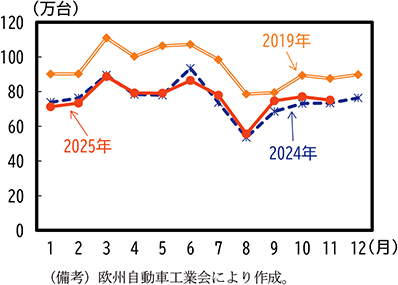 次にユーロ圏全体の自動車新規登録台数を確認すると、高額商品購買意欲の低迷が続く中(第2-3-5図(2))、感染症拡大前の2019年の水準を下回る傾向が継続している(第2-3-6図)。
