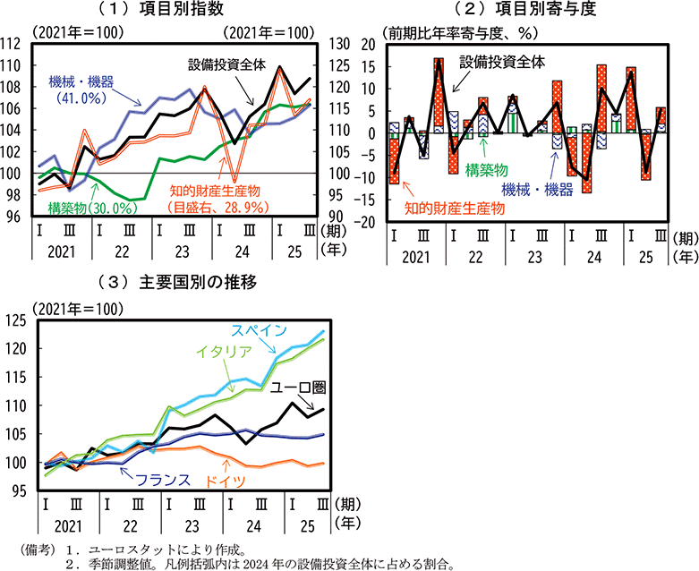 ユーロ圏の設備投資については、今後、こうしたドイツにおける政策効果の発現や、RRF等のEU基金による下支えから、公的投資を中心に持ち直しが続くことが期待される。