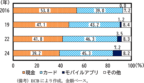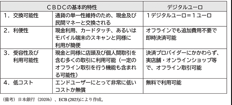 ECBがデジタルユーロの導入を進める背景の一つに、決済手段におけるデジタル決済の増加がある。ユーロ圏ではデジタル決済の利用が増え、現金取引が減少している(図1)。一方、デジタル決済のシステムは非欧州企業のカードやプロバイダーに依存していることから、現金を補完する公共のデジタル決済手段の必要性が高まっており、デジタルユーロにより、高いプライバシー性を保持しながら、インターネットへの接続がなくても現金のように支払うことを可能にするとしている(表2)。